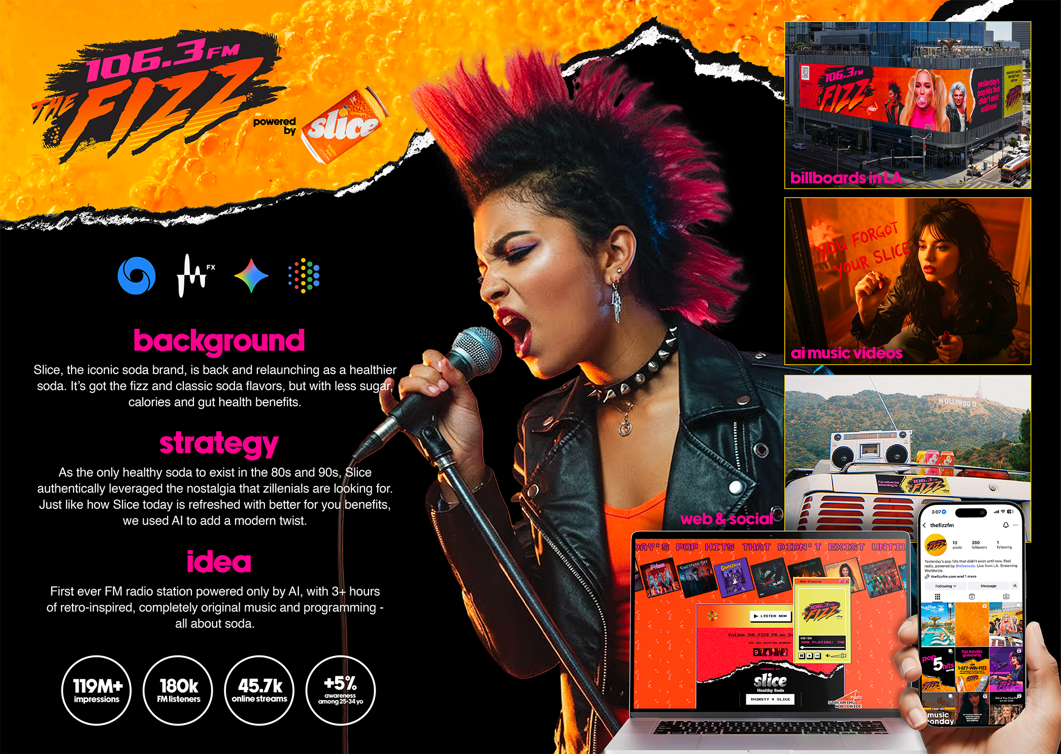 A new FM station in Los Angeles: 106.3 The Fizz FM, is broadcasting entirely AI-generated content. From the DJ and song lyrics to the fictional bands and backstories, everything is created with artificial intelligence. The twist? It’s all part of a marketing push for the return of Slice soda, now with a healthier recipe.